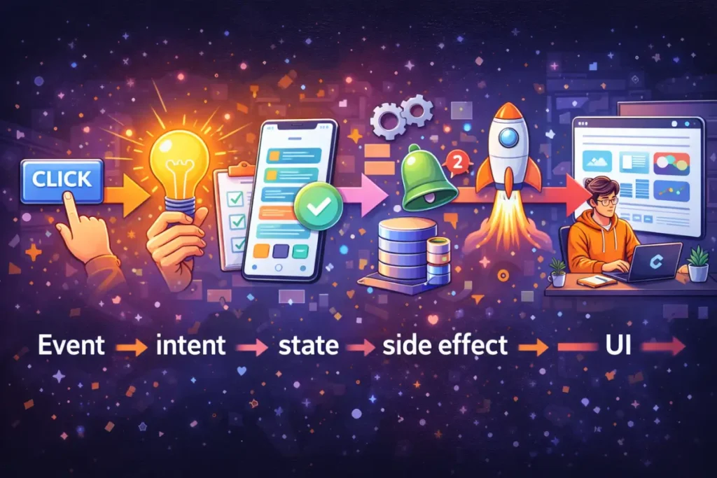 The pro mental model: event → intent → state → side effect → UI