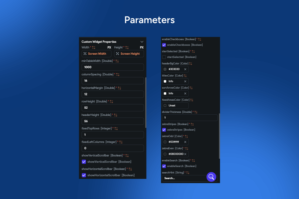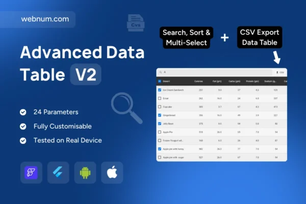 data table, data grid, csv export, copy csv, download csv, excel friendly, utf-8 bom, delimiter options, quoting, escaping, header row, column sorting, global search, filterable table, checkbox selection, select all, bulk actions, pagination, infinite scroll, virtualization, preserve selection, keyboard navigation, aria grid, accessible table, responsive table, admin dashboard, analytics logs, inventory list, orders table, crm list, audit trail, reporting, Flutter widget, FlutterFlow component, modern ui, high performance.