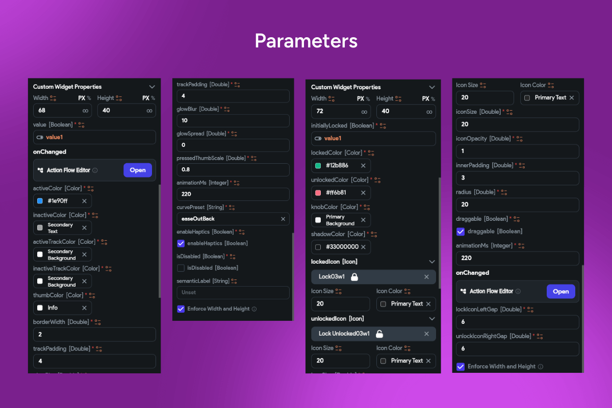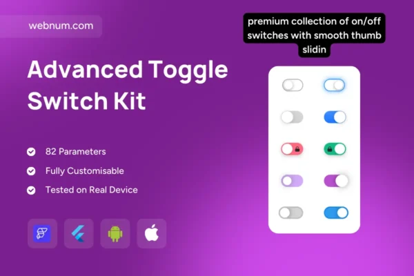 toggle switch, iOS switch, Android switch, on/off control, sliding thumb, glow, outline, gradient, neumorphic, glassy switch, locked state, disabled state, loading state, async toggle, haptic feedback, keyboard navigation, ARIA switch, accessibility, RTL, reduce motion, theming tokens, dark mode, responsive UI, Flutter widget, FlutterFlow component, high performance, modern settings UI.