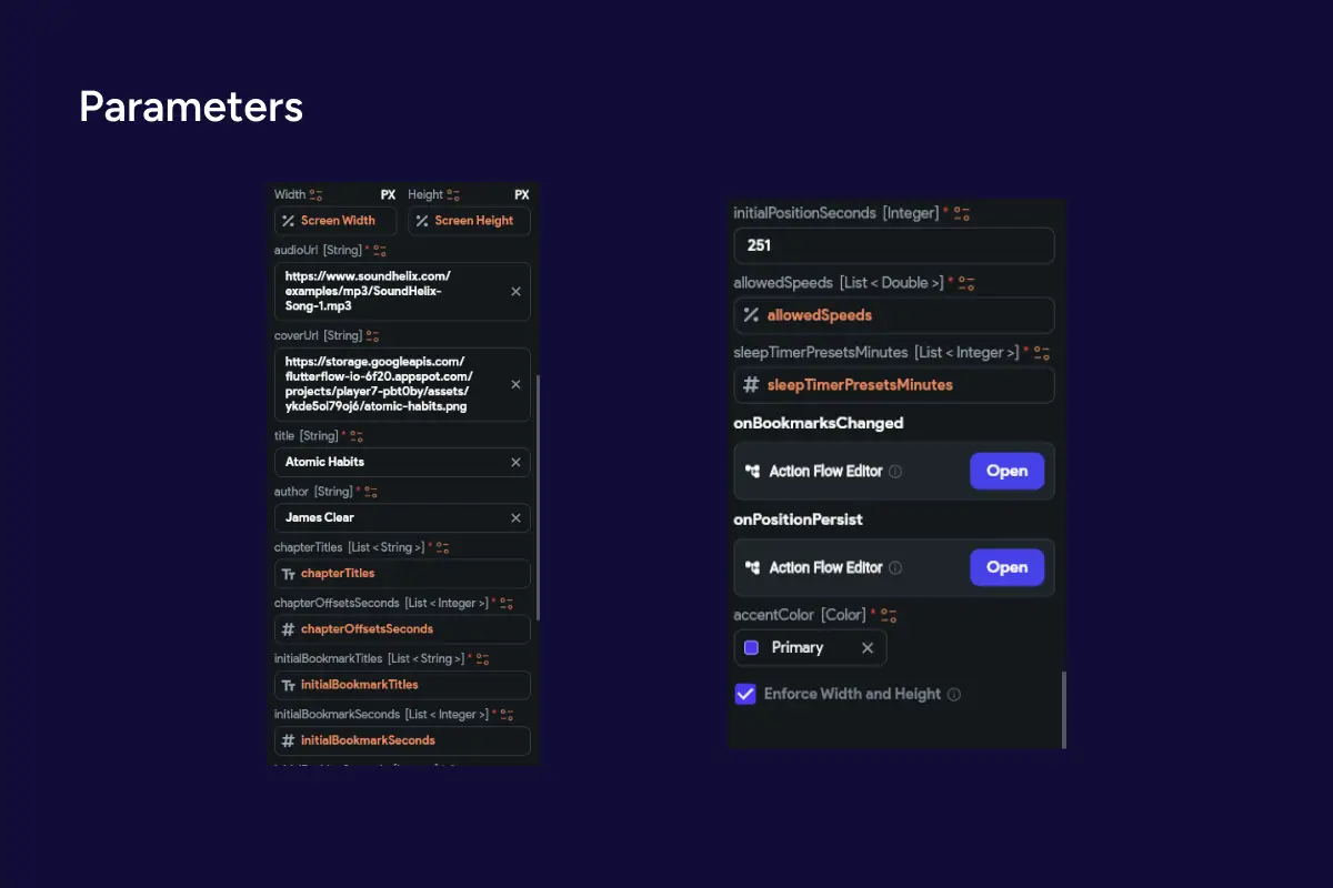 Great for: album pages, now-playing queues, podcast episode lists, lesson playlists, and lightweight media sections inside any FlutterFlow app.