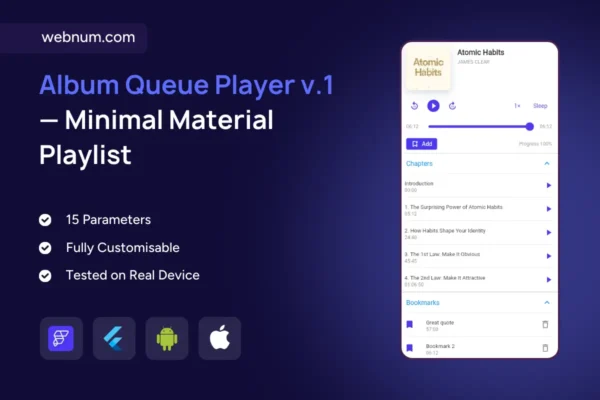A clean, album-style queue for FlutterFlow with crisp typography and a subtle purple accent. Featuring a compact header with artwork, track metadata, and a numbered list with per-row controls, this widget delivers a premium, distraction-free listening experience for music apps, podcasts, and courses. Easy to theme and effortless to wire up to your audio backend.