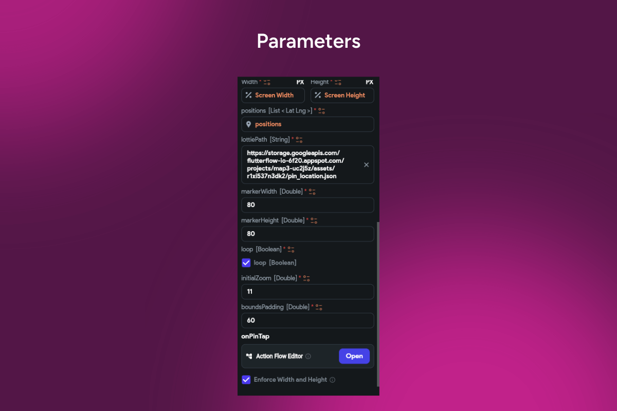 Lottie, animated markers, POI, map pins, Google Maps, Mapbox, Apple Maps, clustering, geolocation, bottom sheet, camera sync, interactive map, Flutter/FlutterFlow.