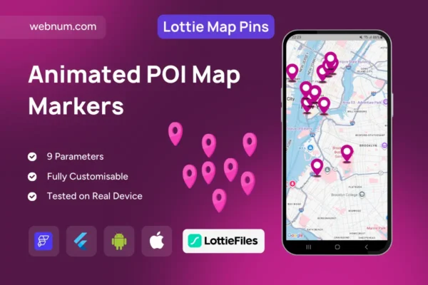 Bring your maps to life with Lottie-driven pins that pulse, bounce, or morph on interaction. This widget renders crisp, lightweight Lottie JSON animations as map markers, supports selected/idle states, clustering, and full theming. Hooks are exposed for tap/long-press, camera movement, and marker state changes so you can sync cards, bottom sheets, or routing seamlessly. Works with Google Maps, Mapbox, or Apple Maps, with asset/network Lottie files and smart caching for smooth performance.