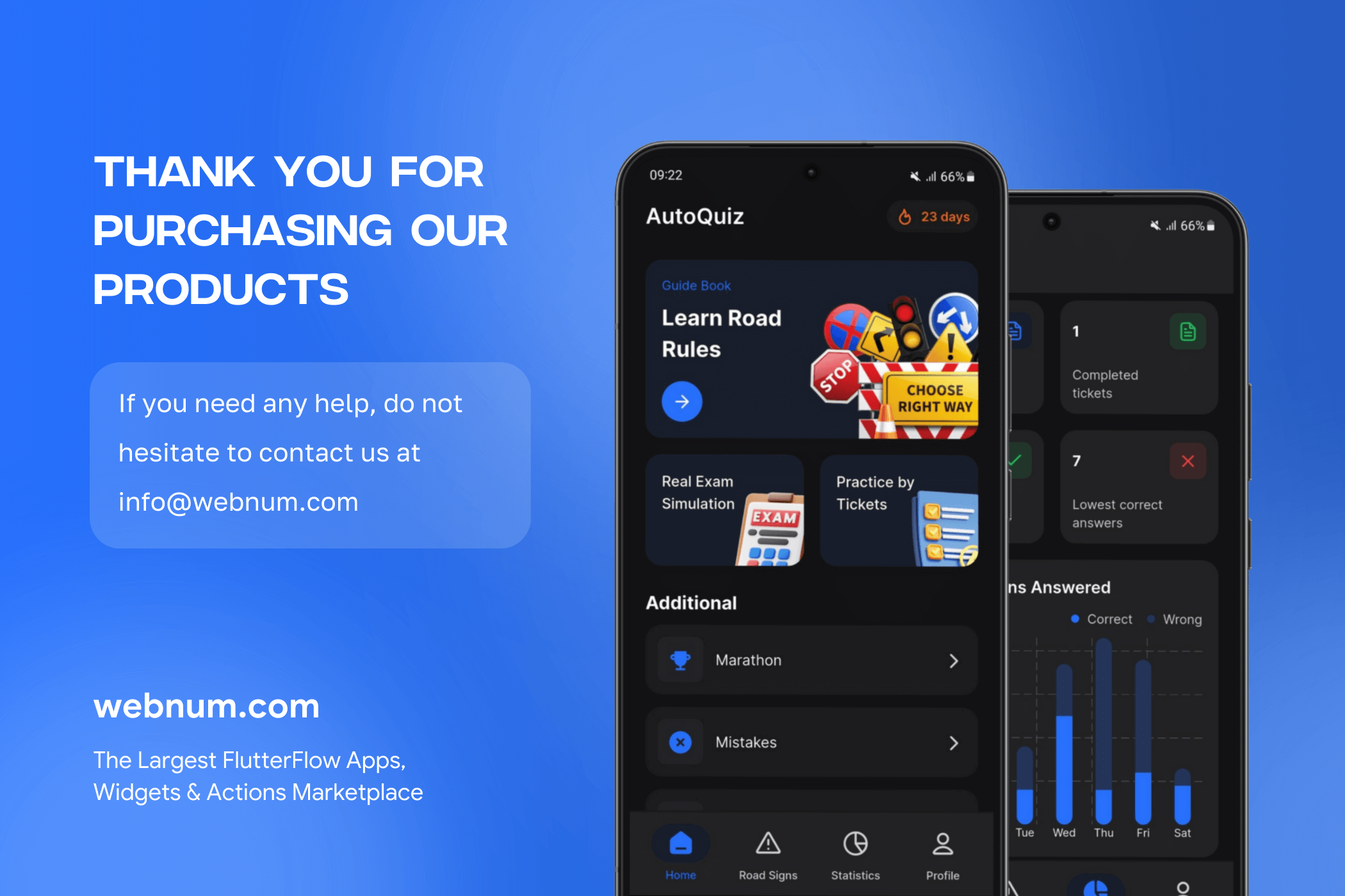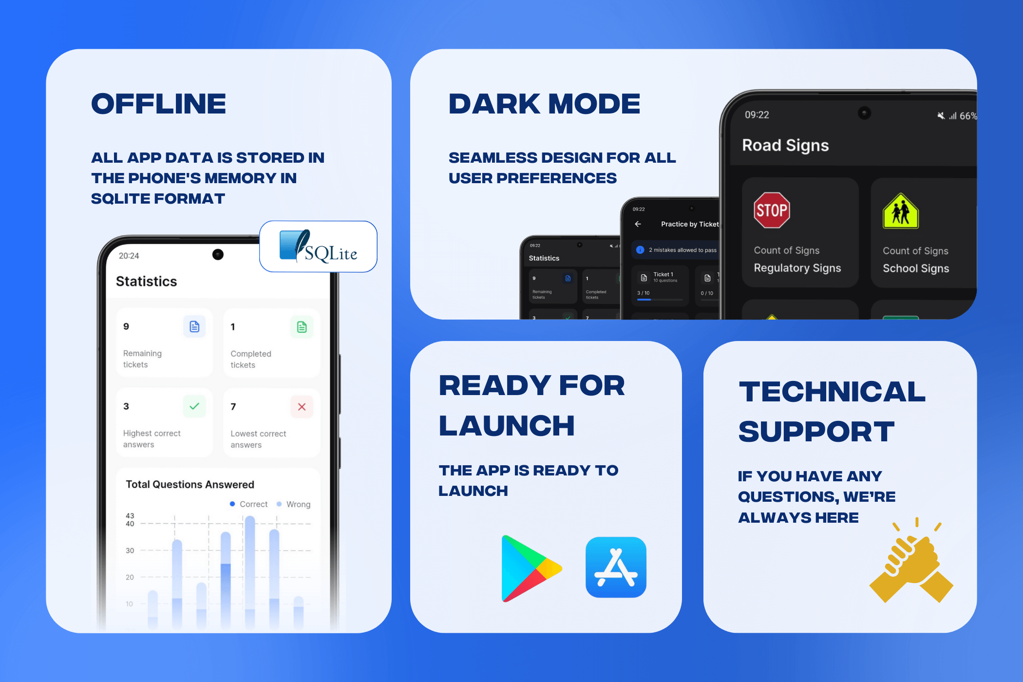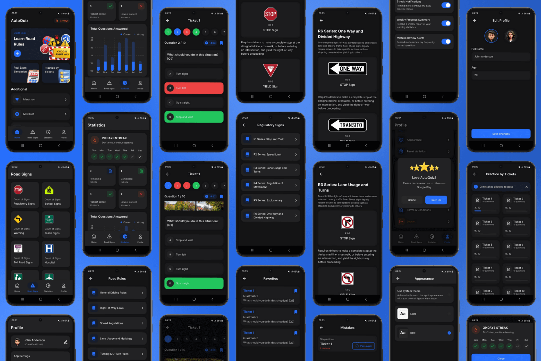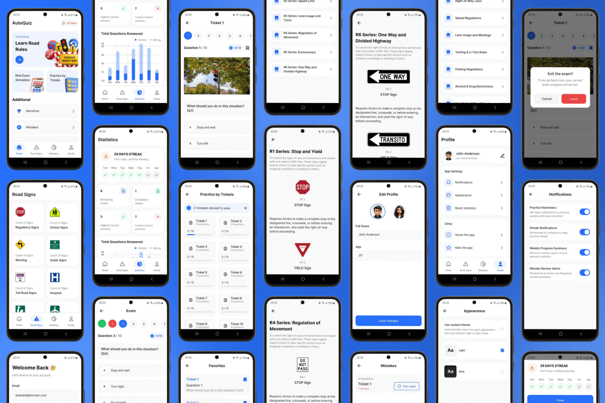 β οΈ Tester Notice: Please note that βRun modeβ currently does not support SQLite databases. For a full demo of the app in action, check the video link below in the description. https://youtu.be/tbNhIkE7pkkPractice anywhere with AutoQuiz: realistic exam simulations, road-sign tutorials, and interactive performance analyticsβall stored locally in SQLite for truly offline access. Enjoy adaptive light & dark modes, fully working out-of-the-box components, and dedicated technical support. Launch your own professional driving-theory test app in minutes! π Key advantages of AutoQuiz: