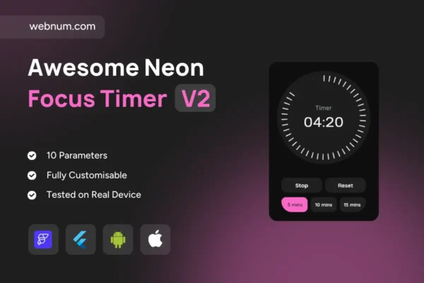 Keywords: timer, countdown timer, focus timer, pomodoro, circular timer, ring progress, tick dial, neon UI, pause resume, stop reset, time presets, MM:SS display, animation, haptics, vibration, completion alert, local notification, background safe, FlutterFlow timer, Flutter widget, customizable colors, stroke width, dash length, gap length, border radius, primary color, secondary color, accessibility, dark mode, light mode, productivity, workout timer, meditation timer, study timer, mobile UI, modern design.