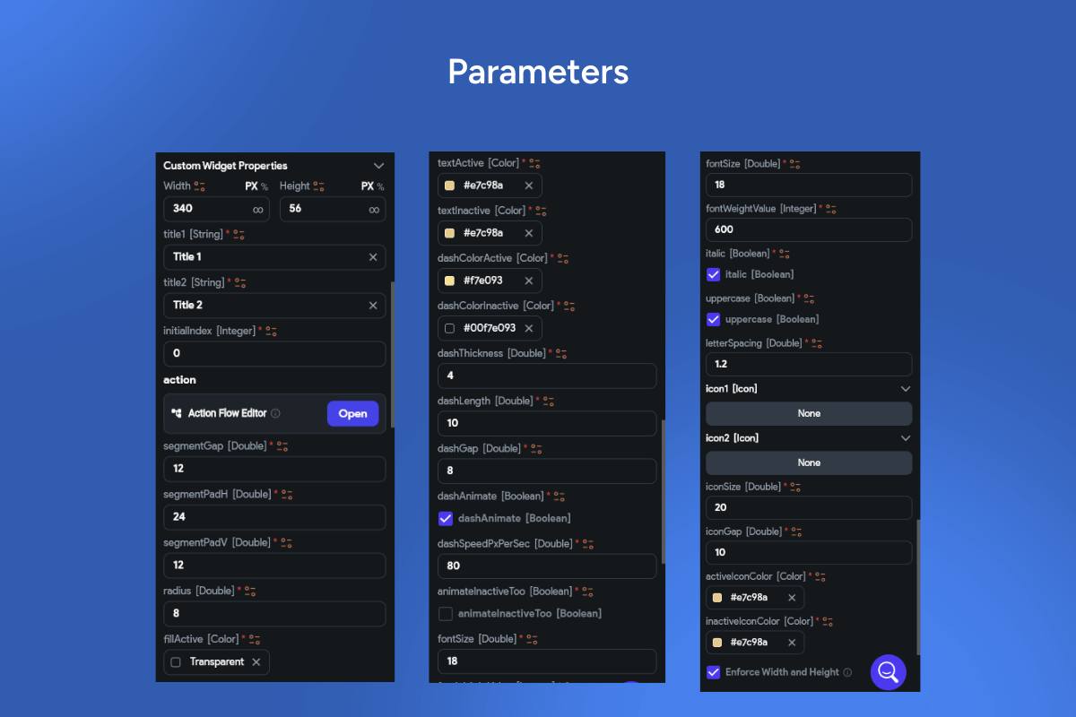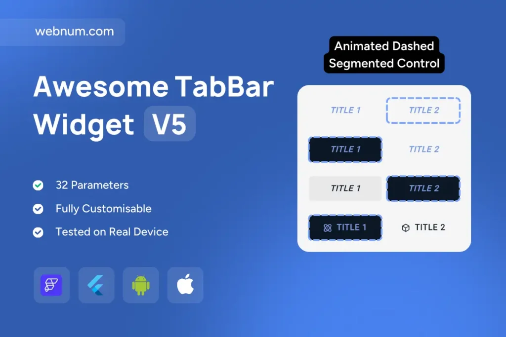 segmented control, segmented button, capsule tabs, dashed outline, marching ants, animated border, ghost button, outline pill, icon with label, badges, haptic feedback, spring animation, hover/pressed, keyboard navigation, ARIA radiogroup, accessibility, RTL, reduce motion, theming tokens, dark mode, scrollable tabs, form field, validation, Flutter widget, FlutterFlow component, premium UI, high performance.