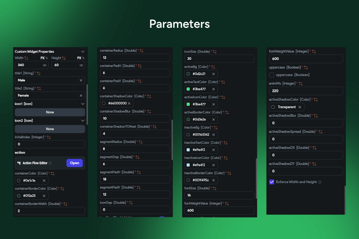 segmented control, segmented toggle, pill selector, sliding highlight, neon glow, glassy fill, icon with label, haptic feedback, spring animation, radio group, single select, badges, tooltip, disabled state, validation, form field, keyboard navigation, ARIA radiogroup, RTL, reduce motion, theming tokens, elevation, dark mode, responsive UI, mobile friendly, Flutter widget, FlutterFlow component, premium UI, high performance.