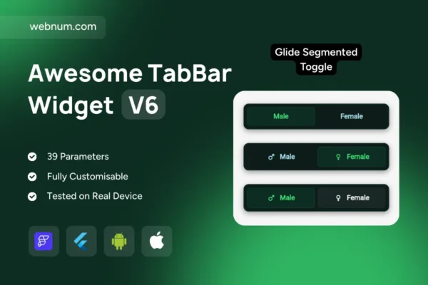 A premium segmented control where a soft glassy highlight slides between options with spring physics. The active segment lifts subtly, the fill gains a neon green glow, and the label (with optional ♂/♀ icon) increases contrast for instant readability. Built for mobile-first forms and filters, it’s fully themeable, keyboard-accessible, and scales from binary to N-way choices without jank.