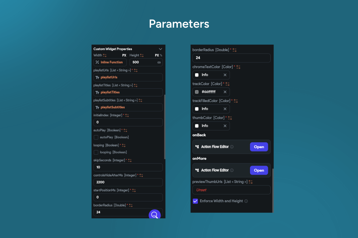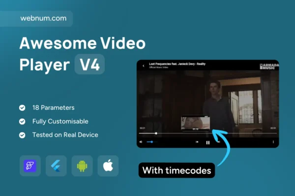 video player, hover thumbnail preview, seek preview, timecodes, chapters, captions, subtitles, quality selector, HLS, DASH, ABR streaming, playback speed, theater mode, picture in picture, fullscreen, volume slider, mute toggle, quick skip, keyboard shortcuts, gesture controls, buffering indicator, error fallback, resume playback, analytics events, responsive video, long-form video, music video player, course video, product demo, Flutter widget, FlutterFlow component, modern media player, adaptive scaling, rounded corners, soft shadow, smooth playback.