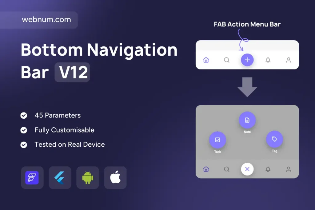 A modern bottom navigation bar with a docked “+” Floating Action Button that expands into a radial quick-actions menu. Tap the FAB to dim the content and reveal three large actions (e.g., Task, Note, Tag). Tap again—or outside the overlay—to close. Perfect for apps that need fast creation flows without cluttering the primary navigation.