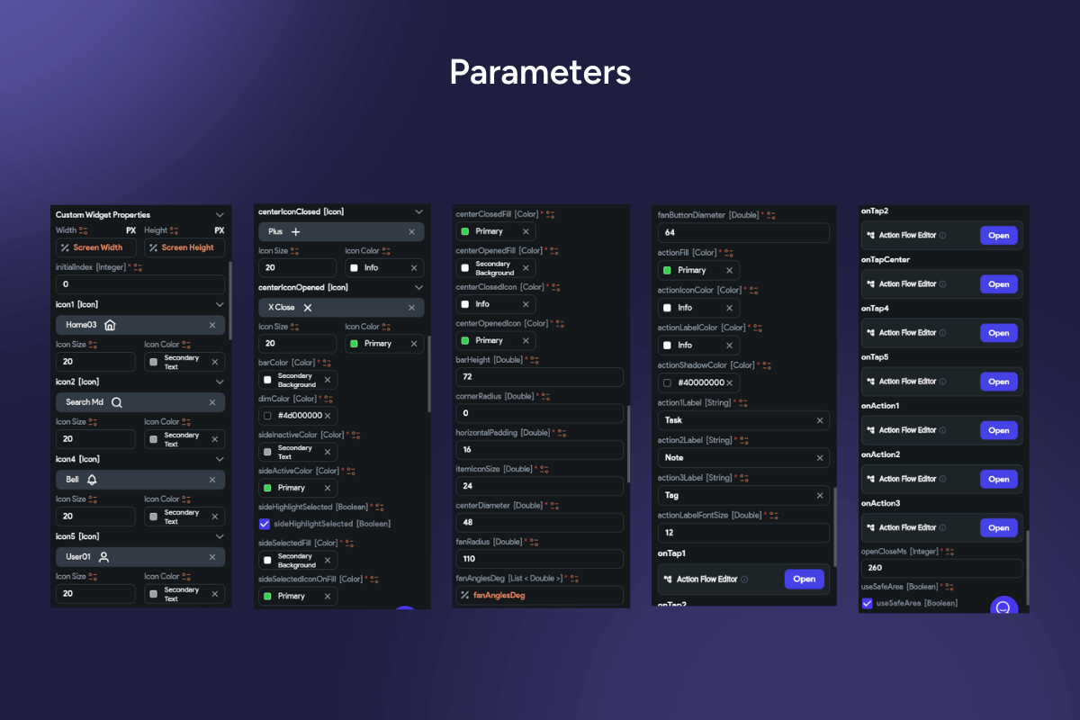 Keywords: bottom navigation, FAB, floating action button, docked FAB, radial menu, speed dial, quick actions, overlay, backdrop scrim, material design, action sheet, morph animation, icon morph, fade scale, tap outside dismiss, safe area, notch support, haptic feedback, accessibility, large hit targets, badges, notifications, theming, elevation, glassmorphism, rounded bar, Flutter widget, FlutterFlow component, mobile navigation, create flow, add button, modal menu, animated menu, production ready.