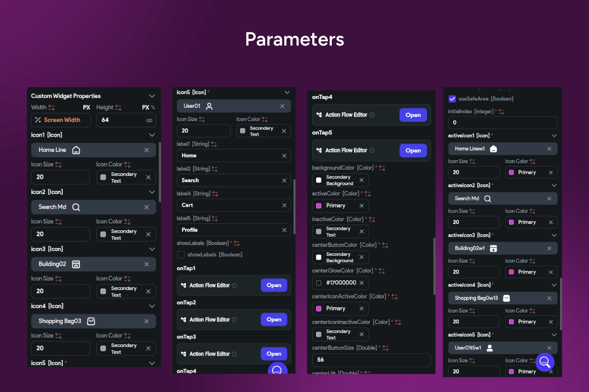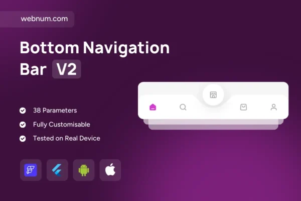 Keywords: bottom navigation, bottom nav bar, curved notch, wave notch, convex app bar, center dock, floating hub, FAB dock, active tab highlight, icon label, badges, notification dot, route navigation, go_router, auto_route, page transitions, PageView sync, hide on scroll, translucent bar, elevation shadow, Material 3, Cupertino style, Lottie icons, SVG icons, theming, gradient background, blur effect, haptic feedback, ripple effect, safe area, accessibility, screen reader, RTL support, adaptive layout, iOS, Android, e-commerce app, marketplace navigation, modern UI, Flutter widget, FlutterFlow component.