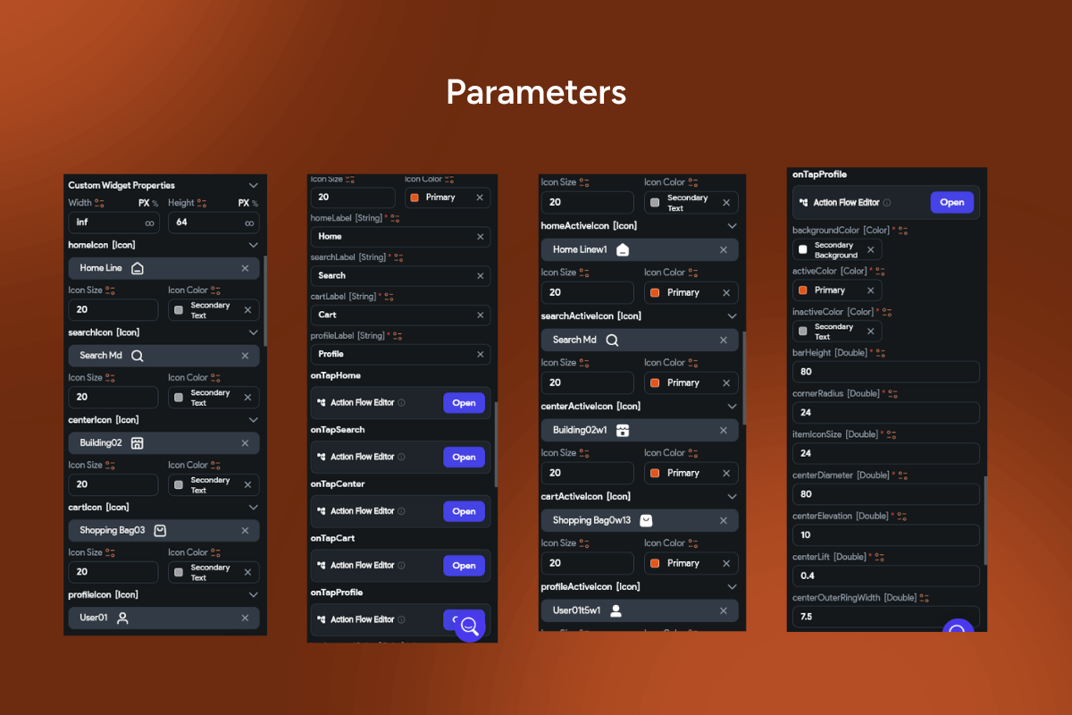 Keywords: bottom navigation, bottom nav bar, active ring, spotlight ring, animated indicator, floating capsule, pill nav, elevation, shadow, icon label, badges, notification dot, route navigation, go_router, auto_route, page transitions, hide on scroll, safe area, notch support, haptic feedback, ripple effect, dark mode, light mode, glassmorphism, blur background, gradient, accessibility, RTL, localization, adaptive layout, Material 3, Cupertino, iOS, Android, Flutter widget, FlutterFlow component, app shell, ecommerce navigation, modern UI, spring animation, configurable parameters.