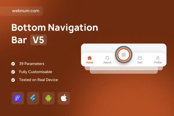 A premium bottom navigation bar that pairs a floating capsule with an animated spotlight ring around the active icon. Designed for storefronts and content apps, it delivers crisp elevation, soft shadows, and springy transitions while keeping labels readable (Home, Search, Cart, Profile).