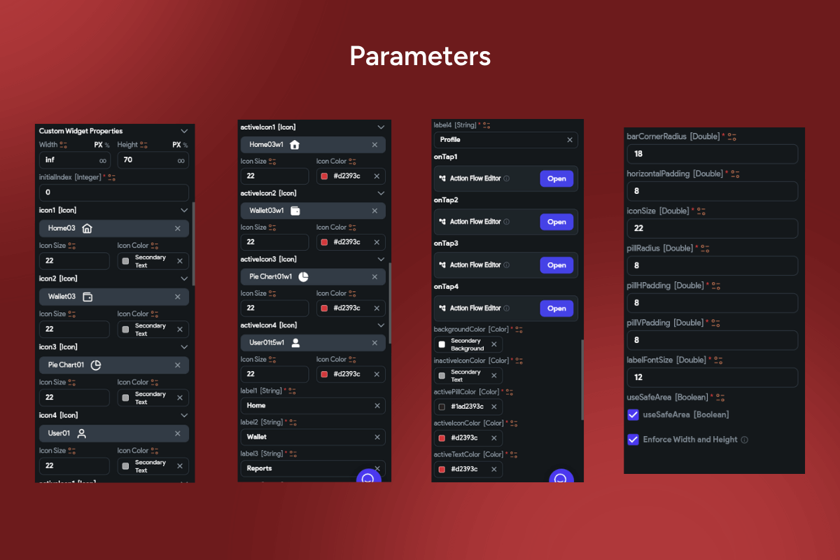 Keywords: bottom navigation, bottom nav bar, pill highlight, capsule tab, active chip, floating bar, glassmorphism, shadow, elevation, icon label, animated tabs, fade scale, slide animation, badges, notification dot, routing, go_router, auto_route, state persistence, hide on scroll, safe area, notch support, gesture insets, haptic feedback, ripple effect, dark mode, light mode, Material 3, Cupertino, accessibility, RTL, localization, ecommerce navigation, dashboard navigation, Flutter widget, FlutterFlow component, modern UI, app shell.