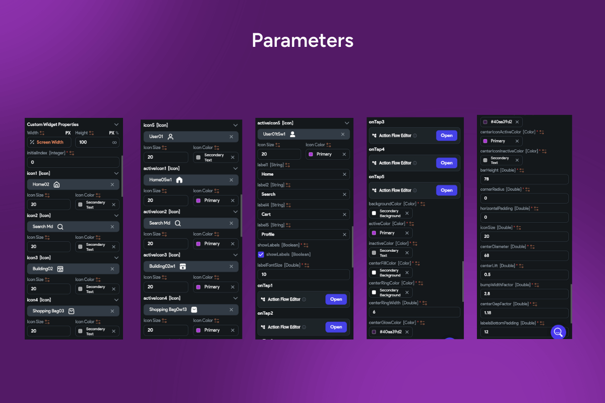 A premium bottom navigation bar featuring a curved “spotlight” ridge that lifts the active tab into a soft, glowing circle. Text labels sit below icons for clarity, while the floating container and layered shadows add depth. With 43 parameters, this bar adapts perfectly to ecommerce, social, media, and dashboard apps on iOS and Android.