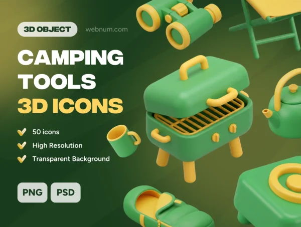 Camping Tools 3D Icons is a premium-quality collection of 50 unique, meticulously crafted 3D assets designed to bring a sense of adventure to your digital products. These high-resolution icons feature a consistent, professional aesthetic with soft textures and transparent backgrounds, ensuring they look stunning on any mobile or web interface.