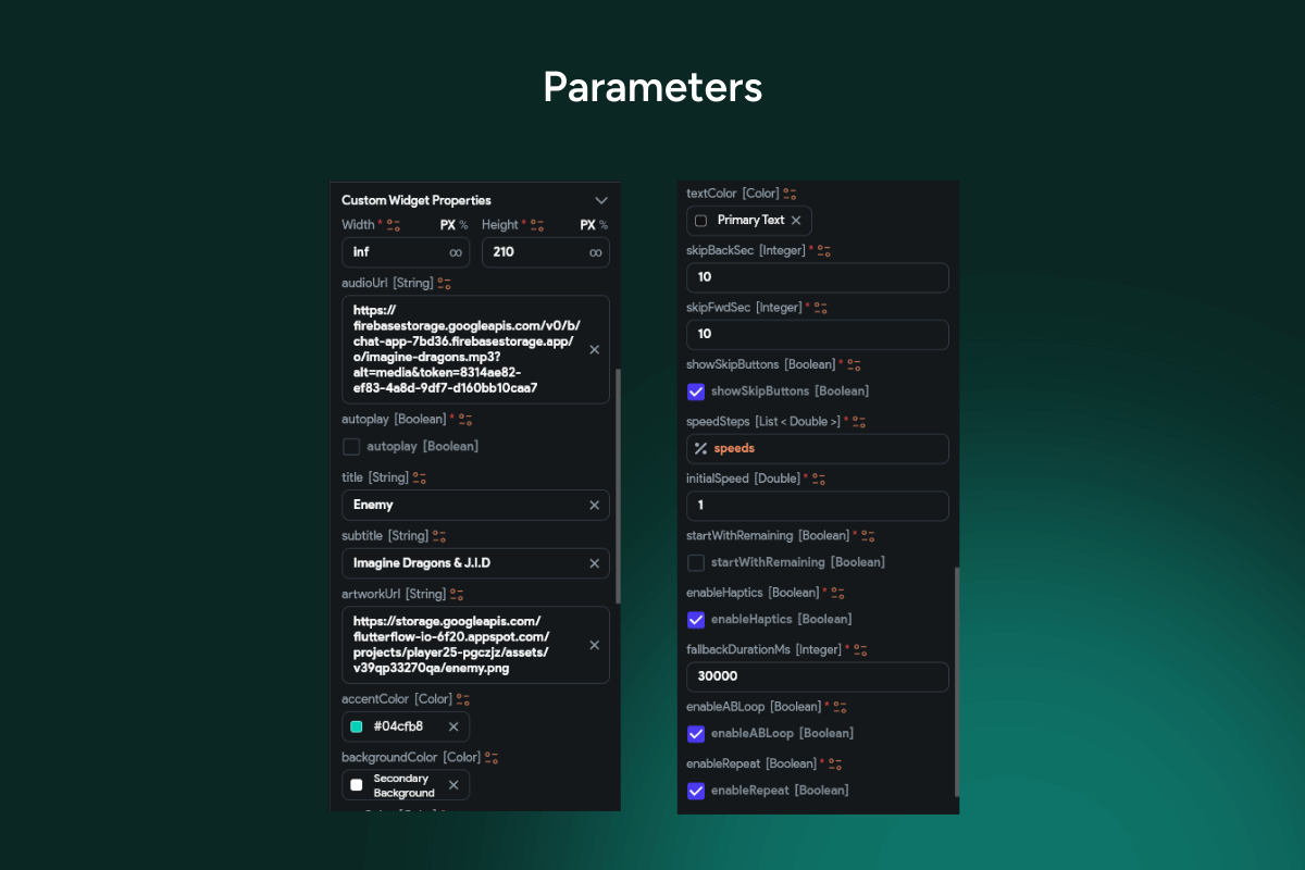 Keywords: FlutterFlow audio player, card player, A-B loop, AB repeat, loop section, playback speed, speed chip, tempo control, seekbar, progress bar, buffered progress, draggable thumb, play pause, previous next, volume mute, time labels, elapsed time, total duration, album artwork, title artist, repeat toggle, practice mode, language learning audio, podcast player, audiobook player, compact UI, rounded card, soft shadow, responsive layout, clean design, modern UX, just_audio integration, audio service, Firestore binding, Supabase storage, REST datasource, accessible controls, premium template, Flutter widget, FlutterFlow component.