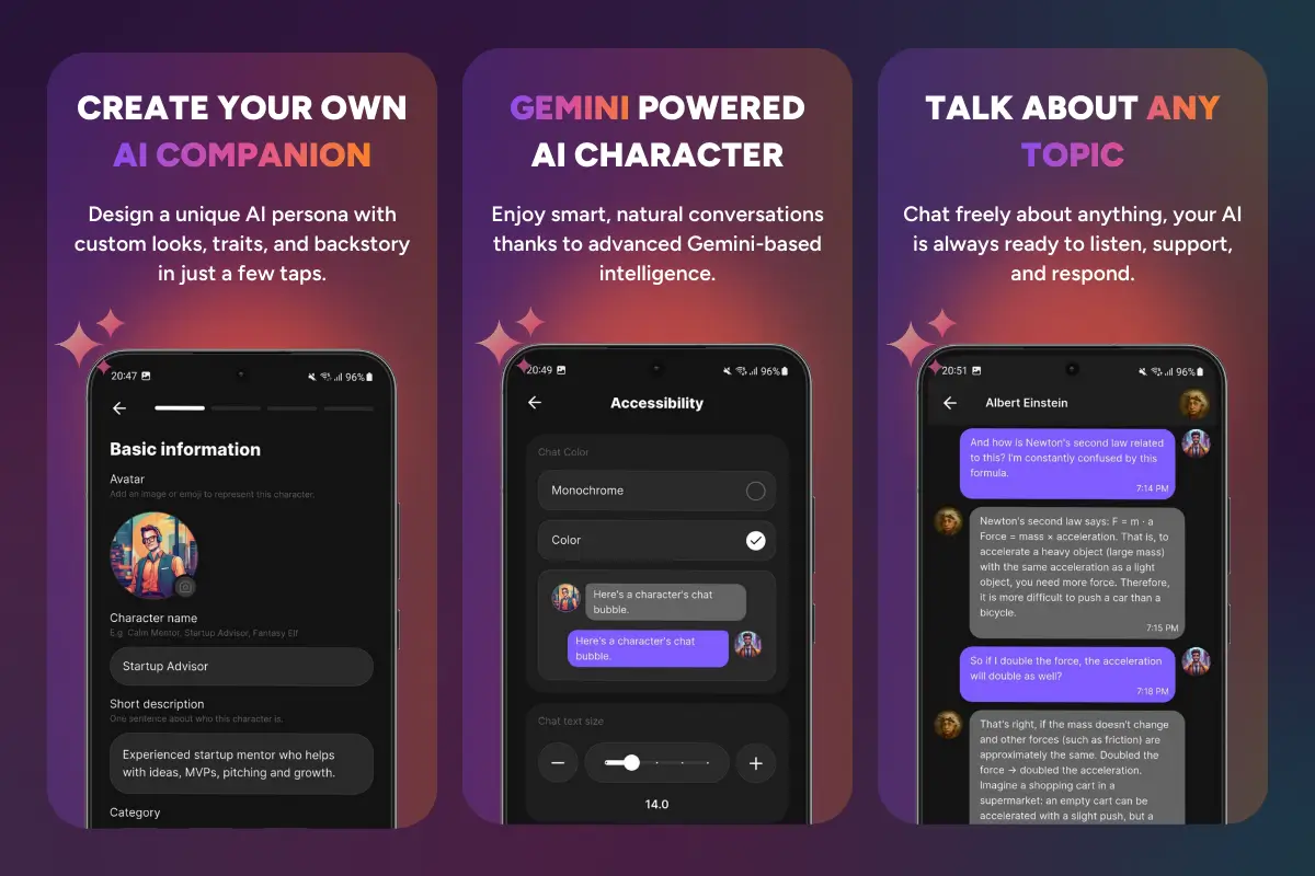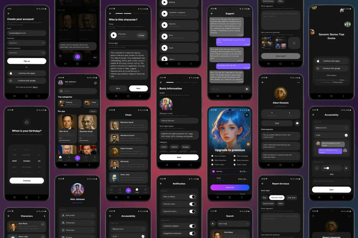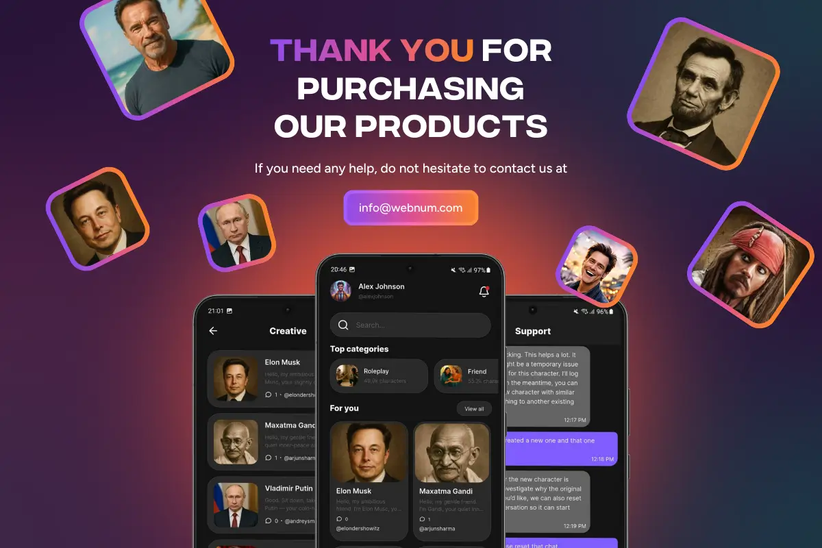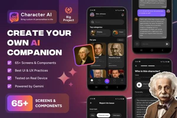 Keywords: character AI app template, AI companion app, AI chatbot app UI, chat with AI companions, AI virtual friend app, role-play chatbot app, roleplay AI characters, AI mentor app, historical figure chatbot, custom AI personalities, AI persona builder, create AI character flow, personality description builder, character categories UI, avatar generator UI, voice settings UI, chatbot conversation UI, modern dark UI, polished dark interface, premium chat app design, accessibility settings UI, chat color modes, text size control, spacing adjustments, monetization ready UI, subscription screens UI, premium paywall UI, in-app purchases UI, chat app onboarding UI, authentication flow UI, profile settings screens, chat history UI, conversation list UI, prompt templates UI, LLM API integration, Gemini ready architecture, Gemini API integration, integrate any LLM, AI chat app template, startup chatbot MVP, production-ready template, 60+ screens design, real device tested UI, mobile-optimized chat UX, microinteractions for chat, easy customization in FlutterFlow, change colors typography icons, developer friendly template, agency reuse template, iOS chat app UI, Android chat app UI, FlutterFlow, Flutter, FlutterFlow template, FlutterFlow AI app, FlutterFlow chatbot app, Flutter AI chat app, Flutter chat UI, Webnum, Webnum templates, Webnum FlutterFlow, Webnum app template, no-code AI app builder, low-code chatbot template