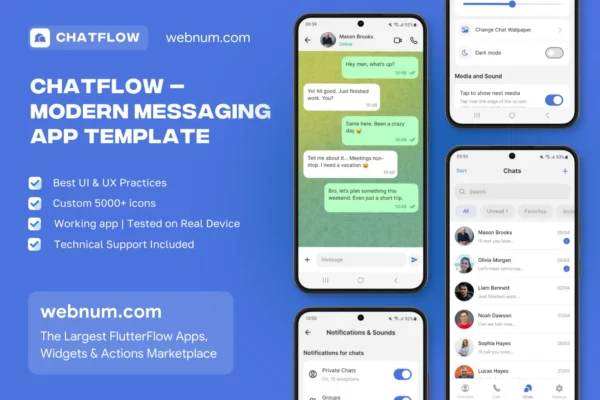 A sleek and modern chat app template built for real-time messaging. Includes chat lists, user profiles and more. Perfect for building apps like WhatsApp, Telegram, or Messenger. Fully customizable and ready to launch.