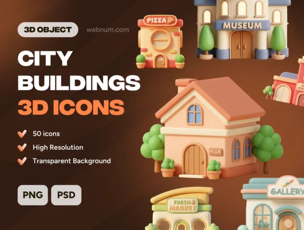 City Buildings 3D Icons is a premium-quality collection featuring 50 unique, meticulously crafted 3D assets designed for game development, city simulation apps, and vibrant digital interfaces. You’ll receive high-resolution icons with a consistent, charming toy-like aesthetic and transparent backgrounds, allowing for seamless integration into any creative project.