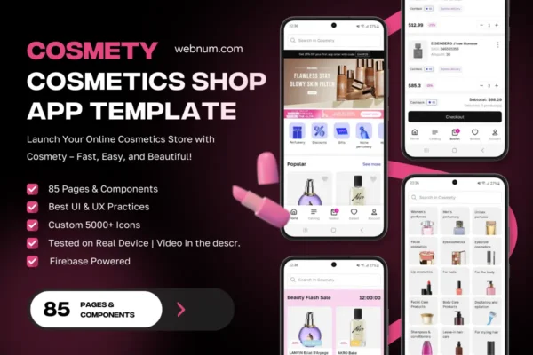 Transform your beauty business with Cosmety, the Ultimate Working app Template designed for a seamless online shopping experience. Packed with all the essential features, Cosmety empowers developers to create an elegant, user-friendly cosmetics shop with ease. Whether it’s adding products to a wishlist, checking order status, or rating favorite items, Cosmety has it all. Complete with a dedicated Admin Dashboard, managing your store has never been easier.