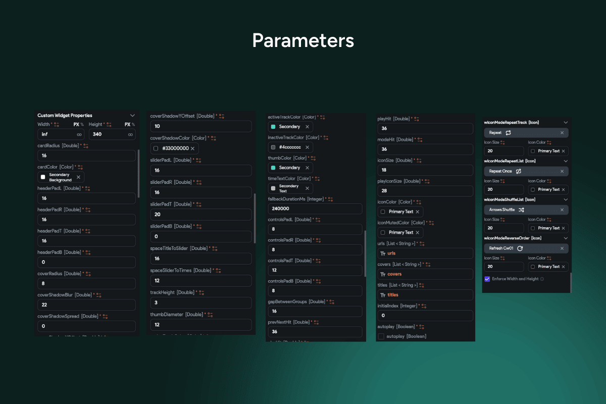 A premium, media-rich player card that spotlights big cover art, elegant typography, and a smooth scrubbable seekbar. The layout balances visuals and control—perfect for detail screens, feature sections, and curated playlists in FlutterFlow.
