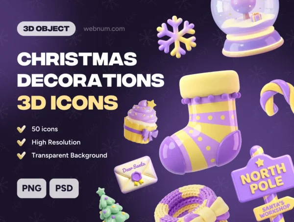 Christmas Decorations 3D Icons is a premium-quality collection featuring 50 unique, meticulously crafted 3D assets designed to bring festive cheer and holiday magic to your digital projects. These high-resolution icons showcase a consistent, vibrant aesthetic with soft textures and transparent backgrounds, ensuring they pop beautifully on any mobile or web interface.