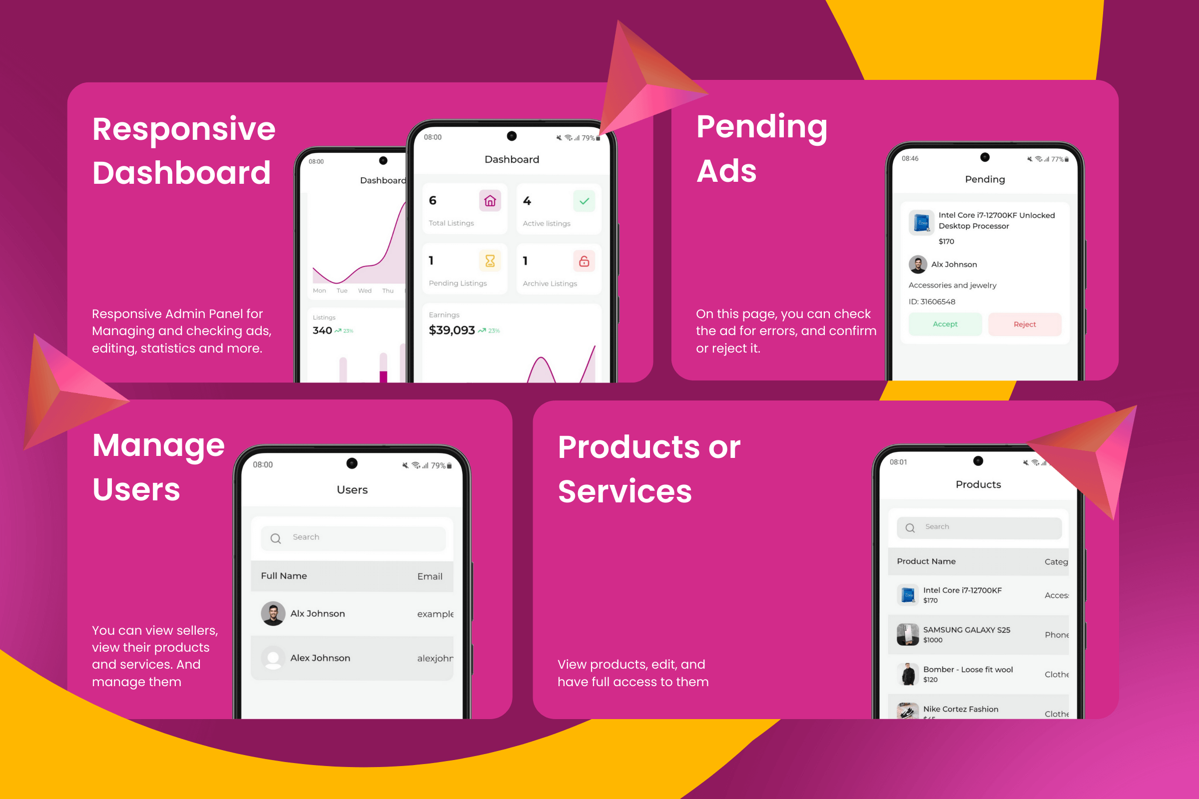 - Robust Admin Panel: Approve or reject every listing with a single click, manage user privileges, and maintain platform quality with granular controls.