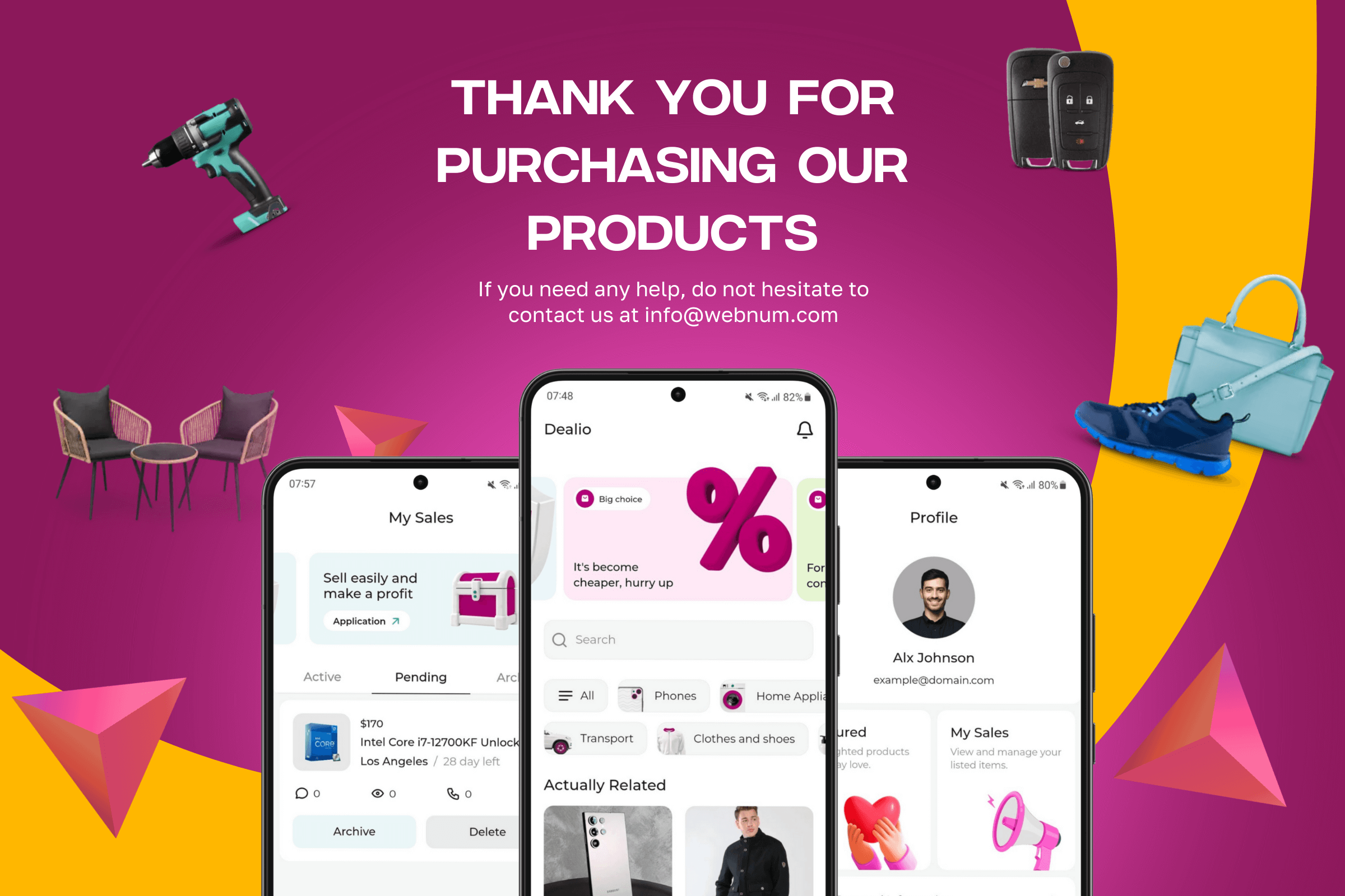 Keywords: dealio, delio, dalio, dealo, buy, buy and sell, sell, marketplace, admin, listing, loop, management, chat, realtime chat, ad, ad approval, ad statistics, service, service app, user listings, ebay, ebay clone, olx, olx clone, dashboard, view count, statistics, B2C, peer-to-peer, local, e-commerce, commerce, cart, shop, buy now, item, price, second hand, second-hand, product, revenue, webnum