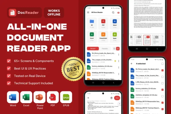 Keywords: document reader app template, offline document reader app, PDF reader app UI, Word document reader, Excel file viewer, PowerPoint viewer app, EPUB reader UI, all-in-one document hub, file manager reader app, open and manage documents, view office files mobile, spreadsheet viewer UI, ebook reader app template, works offline document app, offline file access, documents on the go app, multi-format reader UI, PDF Word Excel PPT EPUB, favorites and bookmarks UI, liked documents UI, recent files history, search documents UI, document categories UI, light and dark mode UI, multi-theme app design, language selector UI, multi-language app template, settings system screens, app settings UI, file permissions screens, premium upsell screens, upgrade to premium flow, subscription screen UI, monthly yearly plans, monetization ready template, ads and subscriptions integration, storage integration ready, local storage file access, cloud storage connection, iOS document reader UI, Android document reader UI, modern clean interface, native feel typography spacing, production-ready screens, ready-to-ship UI kit, startup utility app template, business document app, student document reader, professional file viewer app, FlutterFlow, Flutter, FlutterFlow template, FlutterFlow utility app, FlutterFlow productivity app, Flutter file viewer app, Flutter PDF reader UI, Webnum, Webnum templates, Webnum FlutterFlow, Webnum app template, no-code document reader, low-code file viewer template
