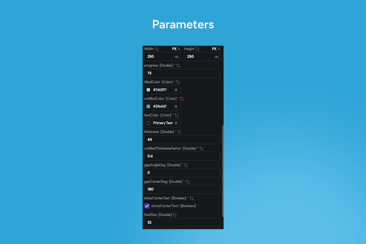 A bold circular progress widget with a thick donut stroke, clean center percentage, and a distinct start gap for easy reading. Supports solid or two-tone sweeps, smooth animations, and full theming—perfect for KPIs, goals, and usage meters in FlutterFlow.