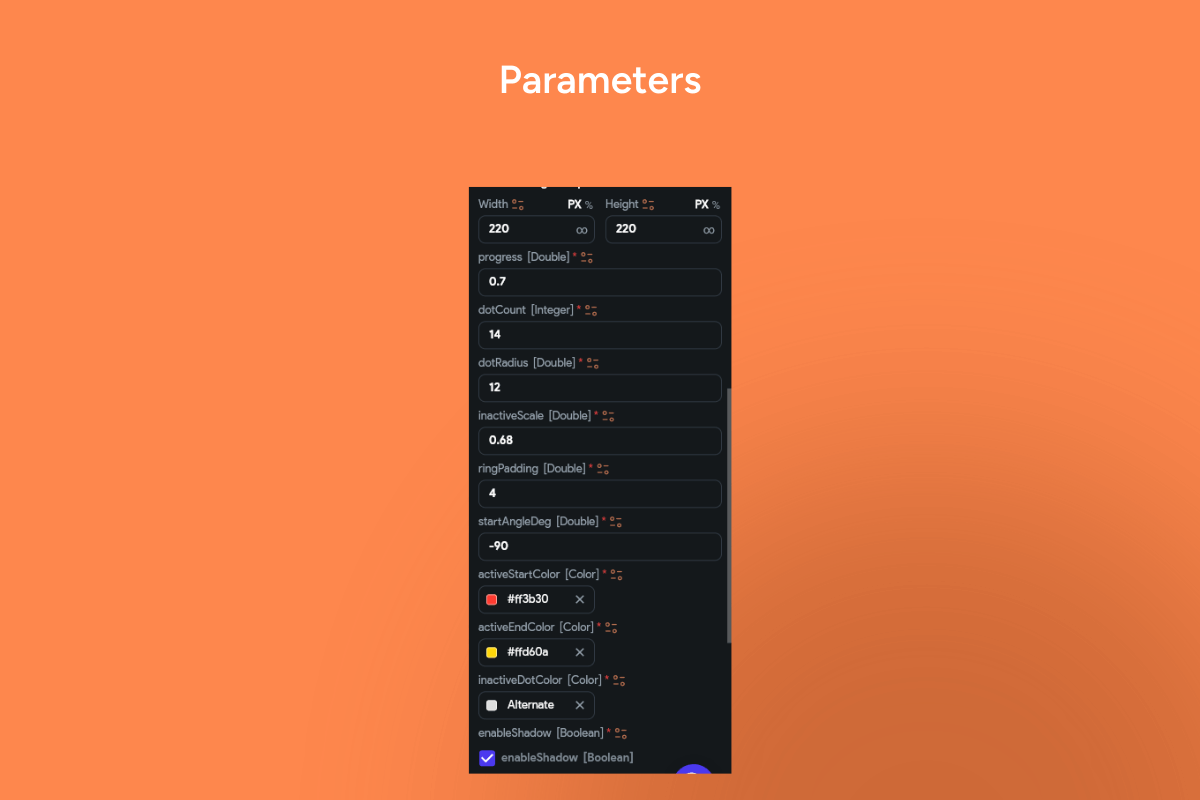 A clean circular progress built from glowing dot markers that light up around the ring as the value grows. The center percentage label keeps the number readable, while the warm gradient (yellow→orange→red) gives instant status feedback. Lightweight, themeable, and perfect for dashboards and habit/KPI cards.
