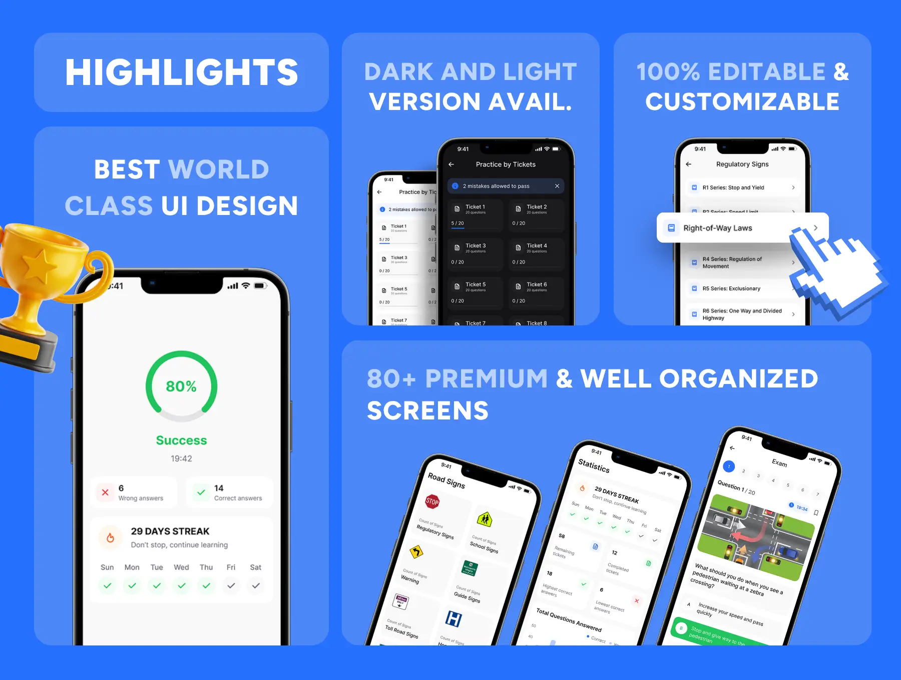 Ship a credible DMV/DVSA learning app fast. AutoQuiz is a production-ready driving test app ui kit with Dark & Light themes, a complete design system, and 80+ polished screens covering the entire learning journey β from onboarding to real exam simulation. Rebrand in minutes, keep everything consistent, and launch faster. β¨