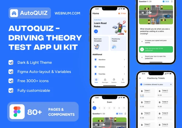 Ship a credible DMV/DVSA learning app fast. AutoQuiz is a production-ready driving test app ui kit with Dark & Light themes, a complete design system, and 80+ polished screens covering the entire learning journey β from onboarding to real exam simulation. Rebrand in minutes, keep everything consistent, and launch faster. β¨