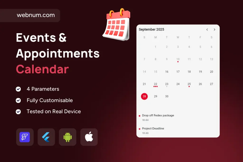 Great for: appointment apps, lesson/tutoring schedules, clinic visits, salon/spa bookings, fitness classes, coworking/room reservations, rentals, and any app that needs a calendar + agenda for bookings.