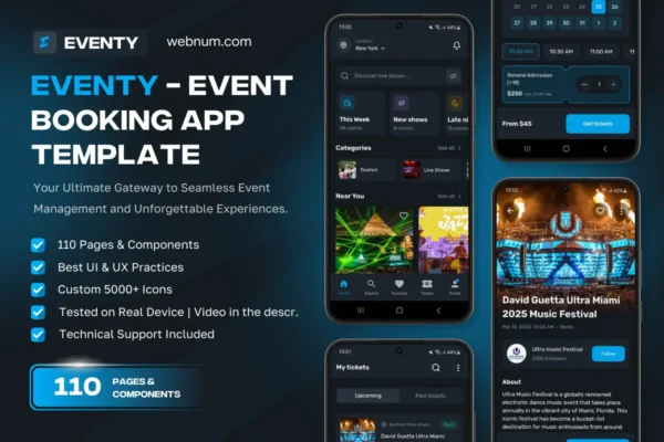 Keywords: Event booking, Event booking app, event, eventy, Event management, Event template, Event app template, Ticket booking system, ticket, Event organizer app, Event booking platform, Event planning app, Event scheduling, Booking system, Event app for festivals, Concert booking app, Event discovery app, Custom event app, ticketing system, ticketing, Concert booking app, Eventbriteб Eventbrite clone, Ticketmaster, Ticketmaster clone, Eventzilla, Cvent, Bizzabo, Splash, Whova, custom calendar, calendar, ticket, timer, swipe, swiper, timeline, tab, tabbar, navbar, custom navigation.