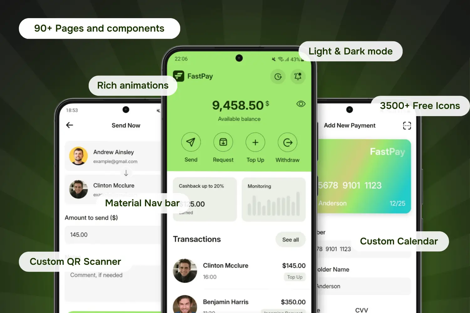 Keywords: Payment, Money, E-wallet, Banking, Fintech, Online payment, Online payment app, Money transfer, Digital wallet, QR code, qr scanner, money, Finance tracking, Transaction, Mobile finance, Send money, Request money, Top up wallet, FastPay, Finance management, budget, Chart, chat, calendar, custom chart, navbar, navigation, nav bar, custom nav bar, material design, Cashback, animations, best app, dark mode, night mode, shimmer, skeleton loading, Paypal clone, wise, wise clone, stripe, stripe clone, rezorpay, revenue cat, subscription, paywall