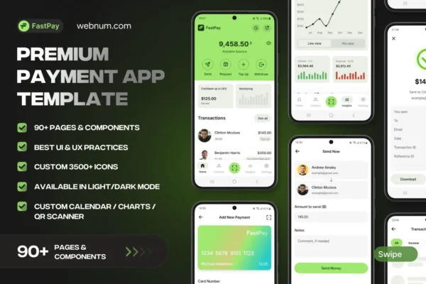 - Complete Money Transfer Template: Send, request, top-up, and withdraw money effortlessly.