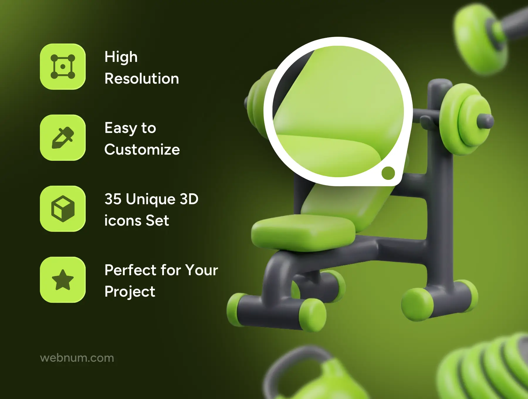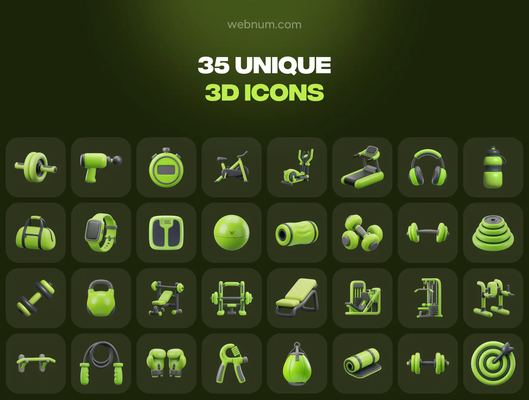 You’ll get high-resolution 3D fitness icons in a fresh green style with transparent backgrounds, making them easy to drop into any interface or marketing layout. Perfect for projects that need a sporty, healthy, and professional look.
