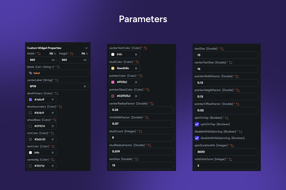 ๐จ Full styling control: wheel size, center button text (SPIN), borders, shadows, pointer color, and more