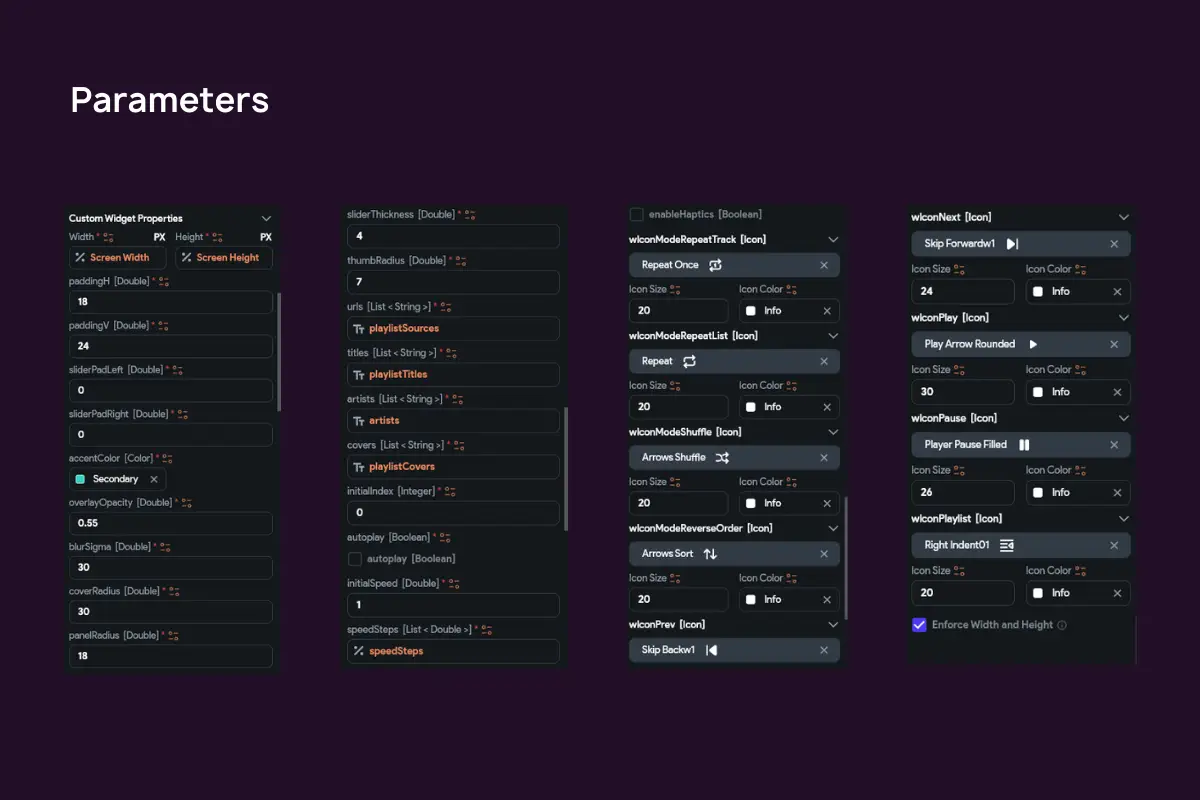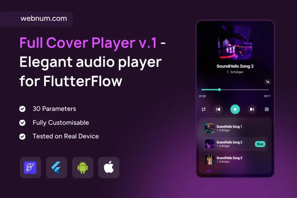 Keywords: FlutterFlow audio player, music player UI, full cover player, now playing screen, seekbar, progress bar, playback speed, 1x speed, just_audio integration, audio service, playlist UI, queue list, glassmorphism, dark mode, rounded cards, soft shadows, mobile media player, podcast player, album cover, track metadata, play pause button, previous next controls, loop toggle, time remaining, elapsed time, active track badge, chip controls, elegant UI, modern UX, Flutter widget, responsive design, gradient background, neumorphism, mini artwork, media controls, FlutterFlow template, premium widget, audio app UI, playlist button, minimal design.