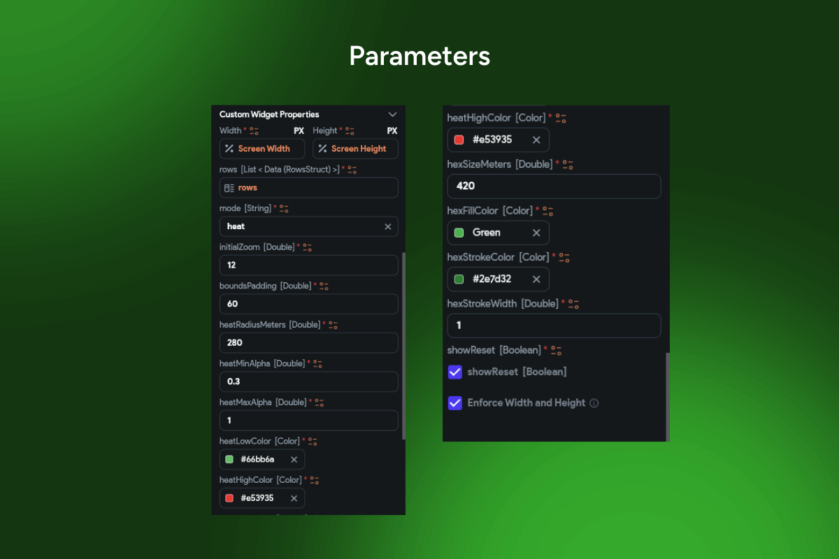 Heatmap overlay, Hexbin aggregation, Density visualization, Weighted points, Radius slider, Intensity control, Step size, Spatial analytics, Google Maps, Flutter, FlutterFlow, Mobile map UI, Hotspots, Geospatial dashboard.