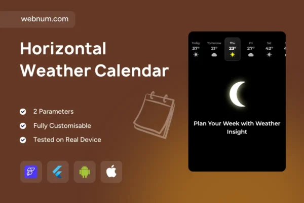 Horizontal Weather Calendar Widget is a fully working FlutterFlow Custom Widget that displays a clean, scrollable weekly weather forecast in a horizontal calendar-style layout. It’s perfect for weather apps, travel planners, event planning apps, fitness/outdoor apps, and any FlutterFlow project that needs a fast “week view” forecast component.