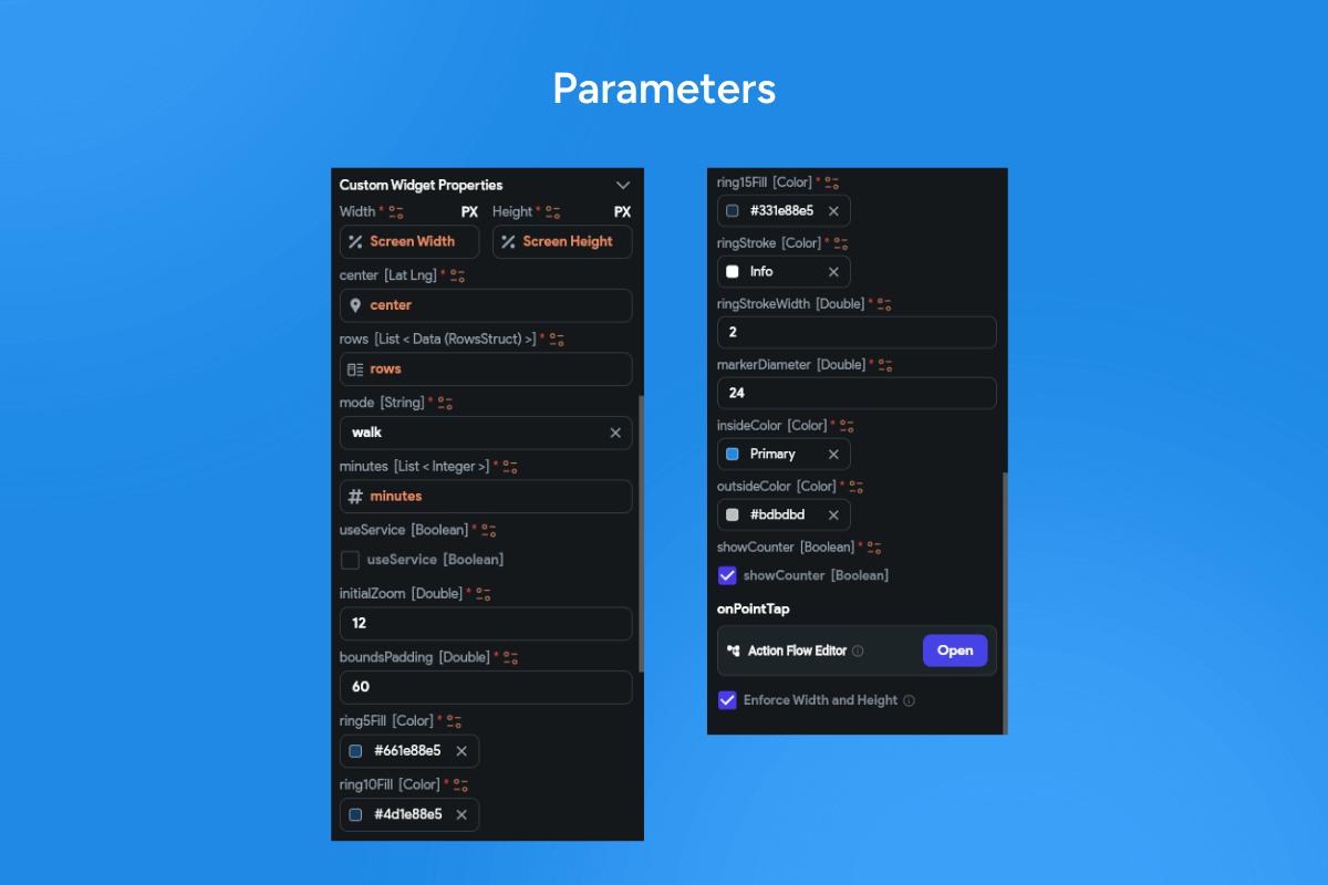 isochrone map, reachable area, travel-time radius, drive-time polygon, walkability, bike radius, catchment area, POI clustering, bottom sheet, route action, geospatial filter, coverage rings