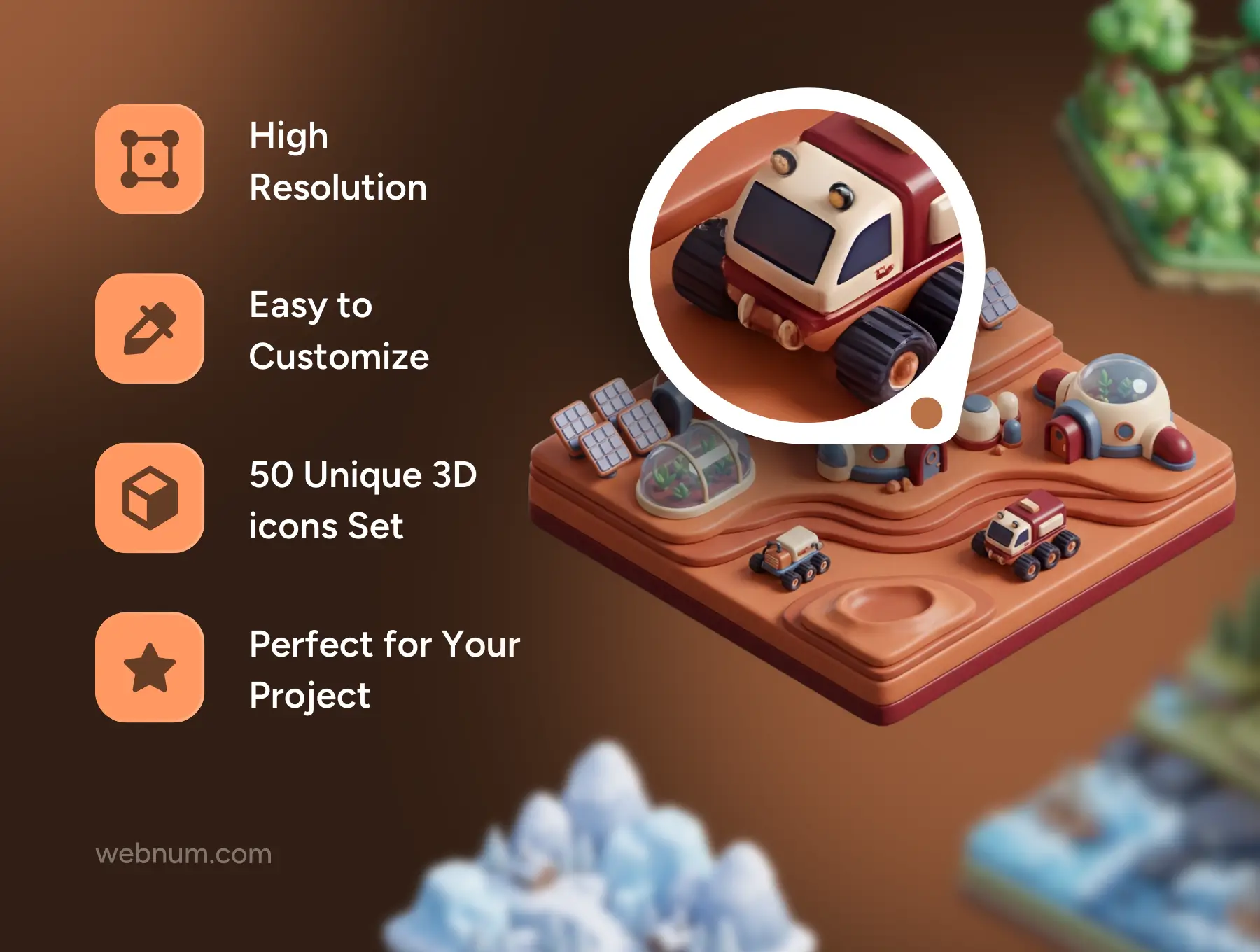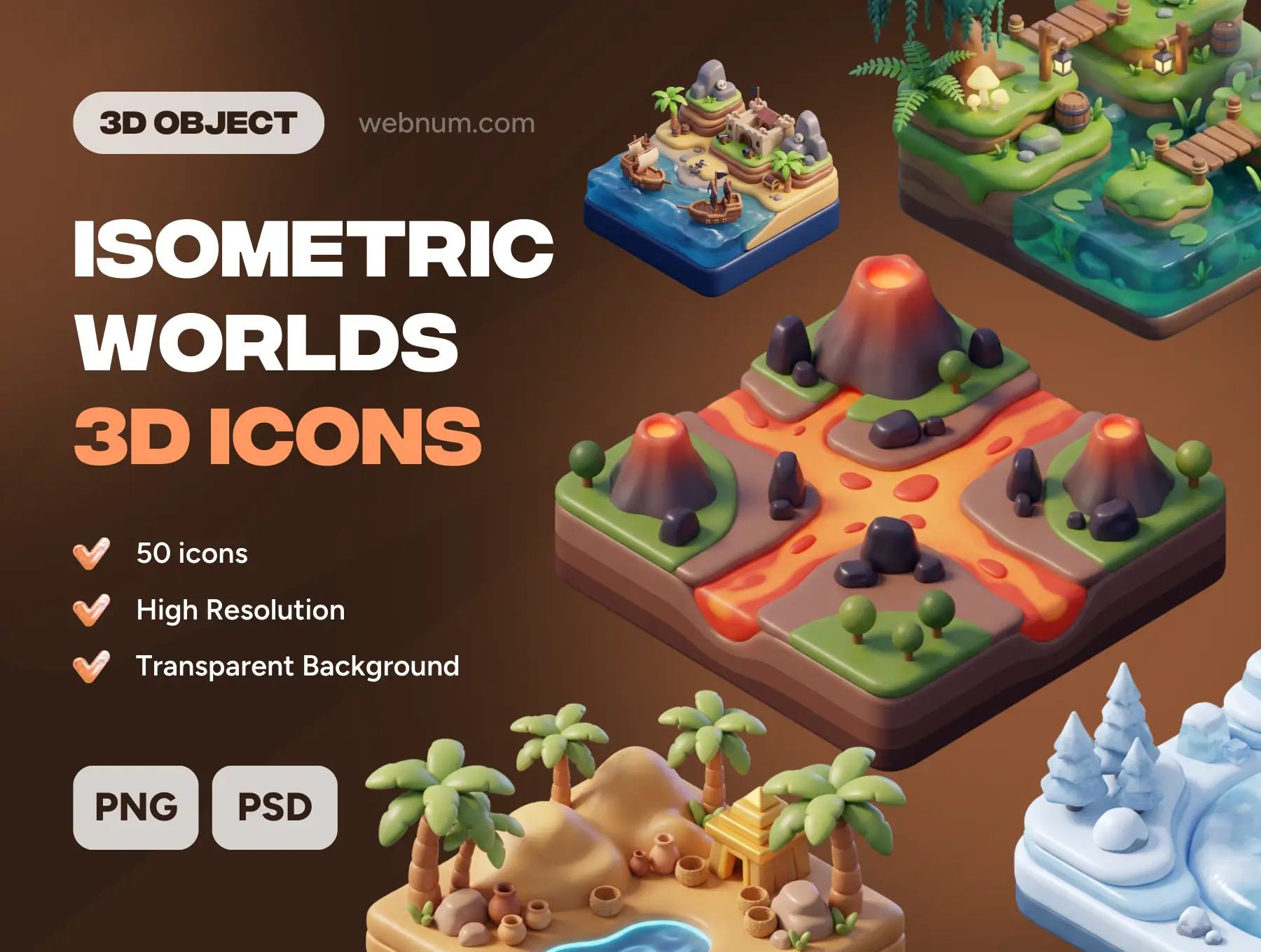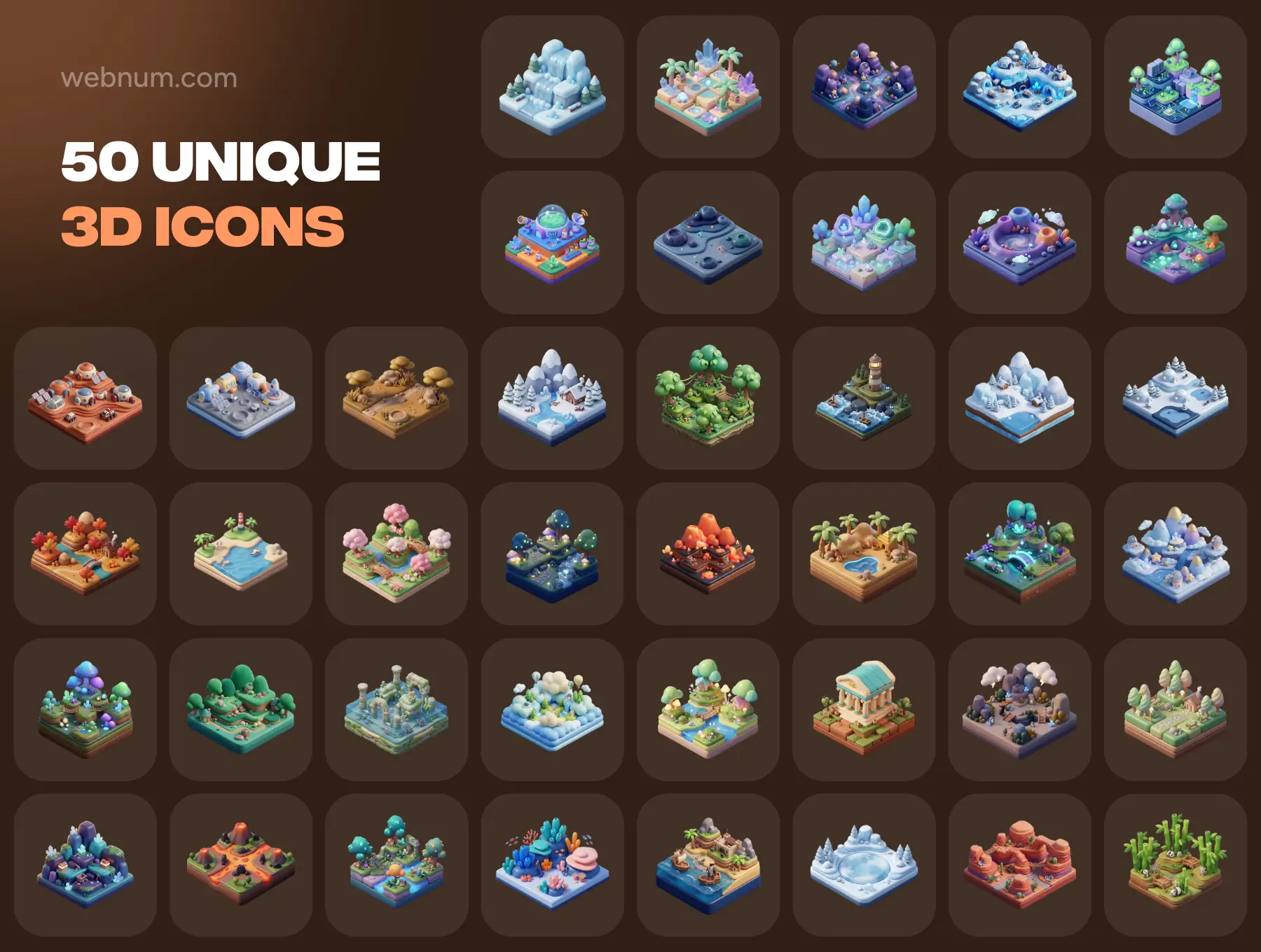 isometric worlds 3d icons, 3d biome pack, game level design assets, isometric landscape icons, world building 3d, stylized environment icons, desert 3d world, forest 3d world, space base 3d icon, moon base isometric, cherry blossom bridge 3d, volcano 3d icon, winter landscape 3d, fantasy world icons, mobile game map graphics, 3d icons for figma, high resolution 3d environments, world map ui kit, isometric mini worlds, rpg level assets, 3d png icons, metaverse design resources, nature 3d assets, stylized isometric icons, game dev environment kit, miniature world graphics.Isometric Worlds 3D icons