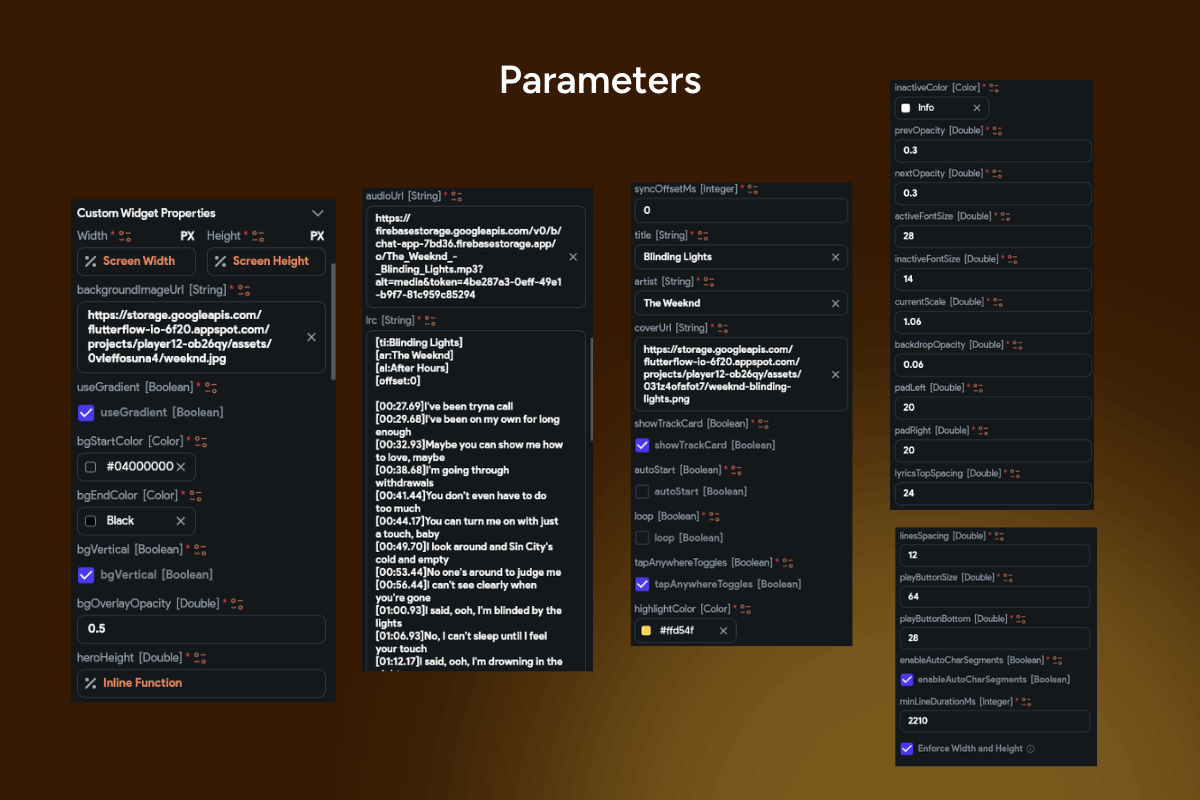 Keywords: FlutterFlow lyrics player, karaoke player, synced lyrics, LRC support, timecoded lyrics, auto scroll, captioning UI, subtitle UI, sing along, now playing screen, blurred background, dynamic backdrop, glassmorphism, highlighted line, phrase highlighting, floating play button, play pause, music app UI, transcript viewer, TTML/JSON timestamps, just_audio integration, audio service, responsive typography, accessibility, dark mode, light theme, album artwork, track metadata, full screen player, premium template, Flutter widget, FlutterFlow component, media controls, cinematic UI, rounded corners, gradient overlay, karaoke mode, performance ready.