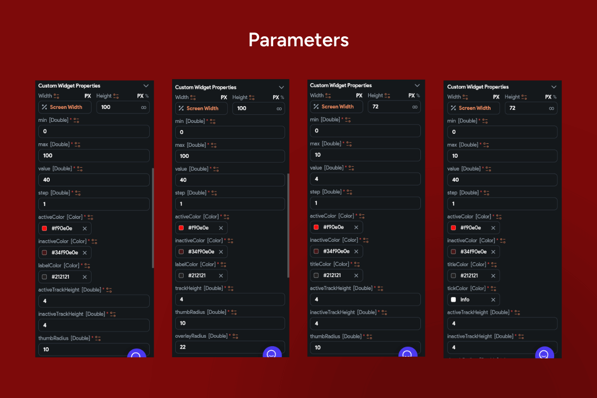 Keywords: FlutterFlow slider, single value slider, value tooltip, rectangular tooltip, paddle tooltip, text badge, icon thumb, numeric labels, tick marks, divisions, step size, snap to step, active track, inactive track, ripple feedback, keyboard control, RTL support, accessible slider, semantic labels, min max bounds, precision control, number formatter, unit formatter, themeable colors, track height, thumb radius, tooltip style, light mode, dark mode, responsive UI, data binding, Firestore integration, Supabase integration, REST API, modern UI, smooth animation, settings control, analytics filter, mobile widget, Flutter widget, FlutterFlow component.