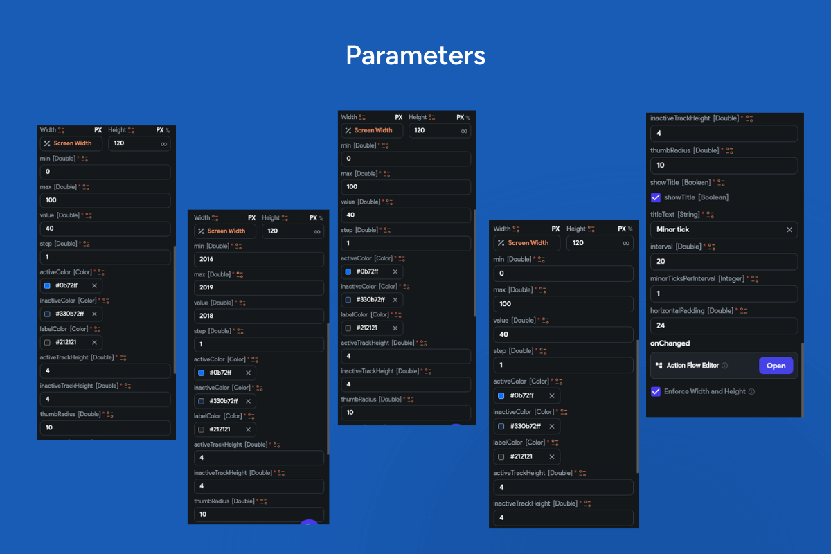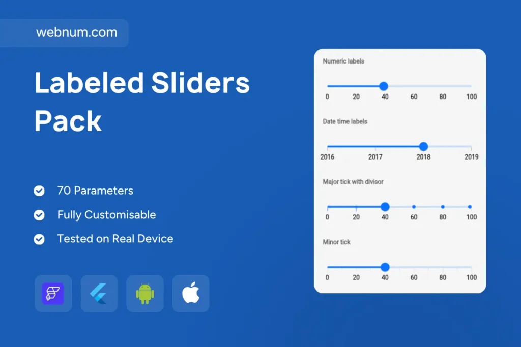 Keywords: FlutterFlow slider, labeled slider, numeric labels, date labels, datetime scale, tick marks, major ticks, minor ticks, divisions, step size, snap to ticks, single value slider, active track, thumb control, tooltip value, unit formatter, currency formatter, precision control, min max bounds, RTL support, keyboard control, accessible slider, high contrast, responsive UI, theming, track height, tick density, Flutter widget, FlutterFlow component, analytics filter, settings control, modern UI, smooth animation.