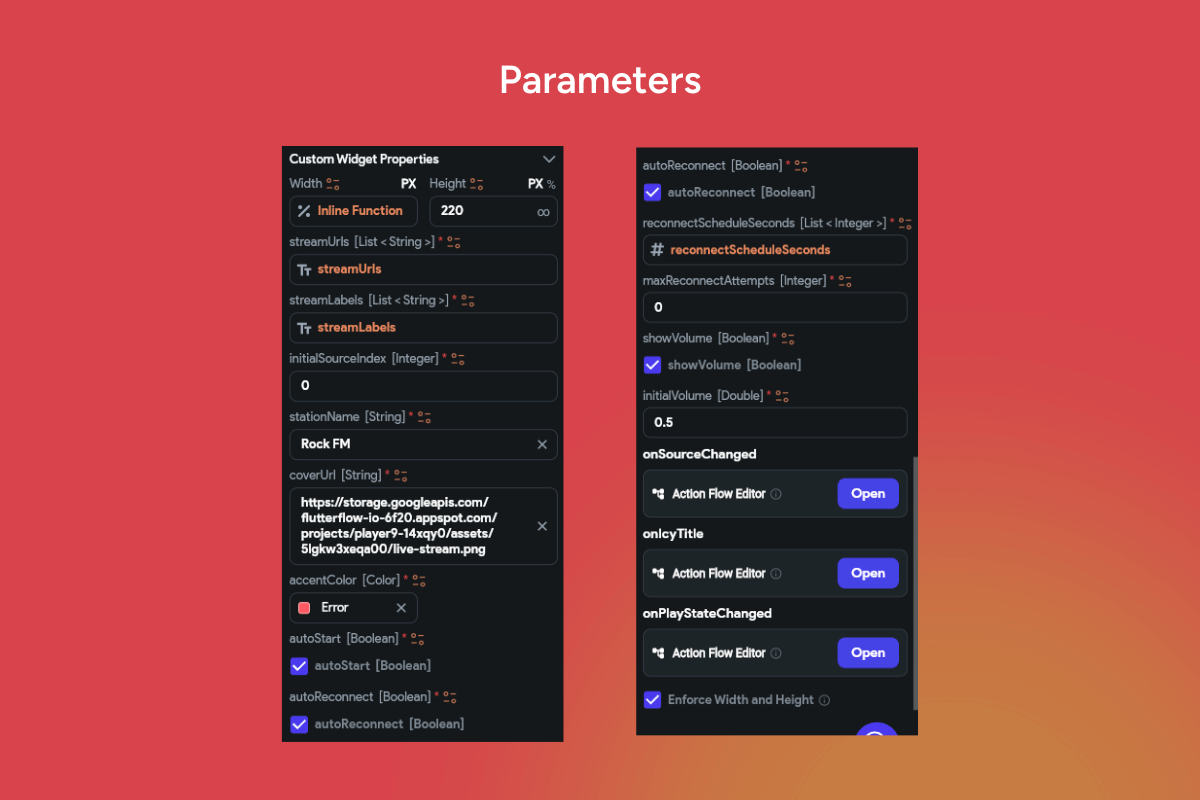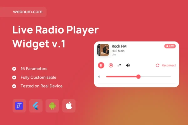 Keywords: FlutterFlow radio player, live radio, streaming audio, HLS player, Icecast, SHOUTcast, AAC stream, MP3 stream, Opus stream, play pause, stop button, reconnect, auto reconnect, volume slider, mute toggle, live badge, station artwork, station logo, stream switcher, backup stream, buffering status, mobile media player, internet radio app, background audio, just_audio integration, audio service, Flutter widget, rounded card UI, minimal player, clean design, premium template, responsive layout, dark mode, light theme, streaming UI, network recovery, FlutterFlow component.